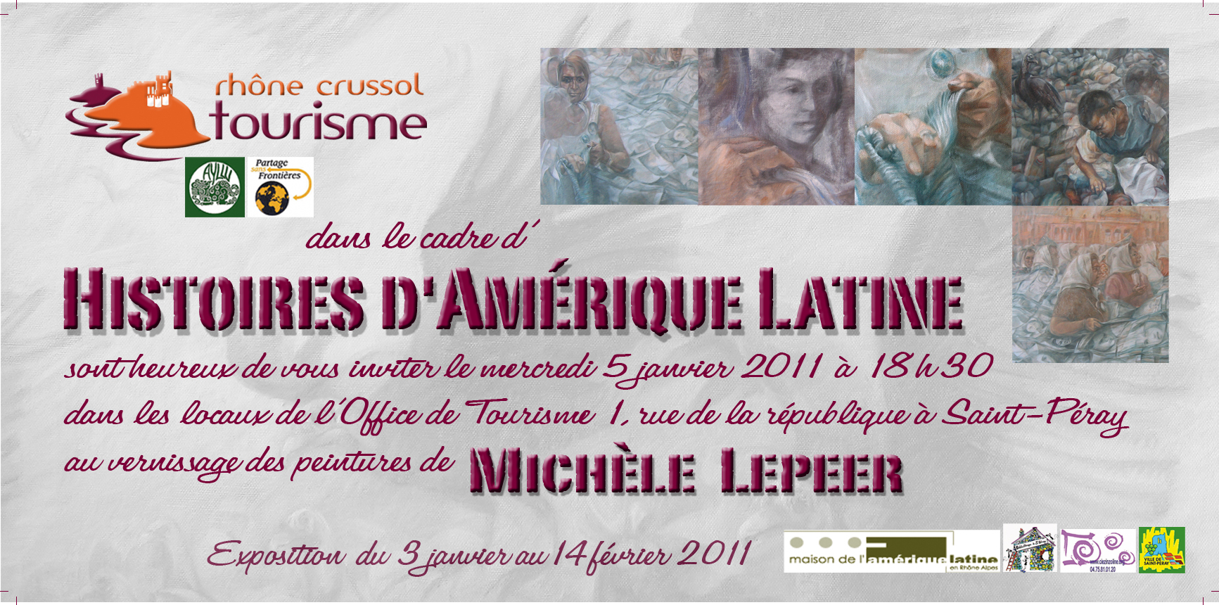 - du 02 au 05/02/2011 : dixième semaine "Histoires d'Amérique latine" à Saint-Péray, la Cacharde (07), le programme est à votre disposition au format Html et au format PDF. L'affiche de l'exposition à l'office de tourisme est ici, ainsi que l'invitation. Les photos de l'inauguration de l'exposition de peinture de Michèle Lepeer sont à votre disposition. Les photos du spectacle de Gilbert Brossard Année 1850 - Native American et le journal de Sarah 10 ans. Les photos de la lecture de texte latino-américains. Les photos de la journée avec Juan Carlos Cacères.